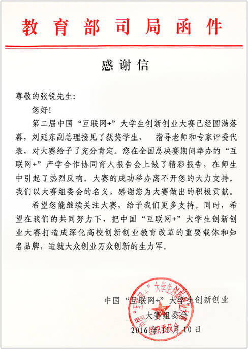 2018年,NG28连续多年为中国国际互联网+大学生创新创业大赛做出积极贡献,获教育部来函致谢。